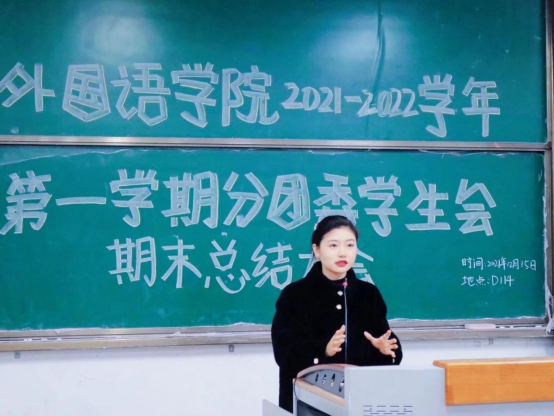 2021年12月15日20:20,外国语学院分团委学生会于D114召开2021-2022学年第一学期分团委学生会期末总结大会。外国语学院分团委书记杨娟老师莅临本次会议,外国语学院分团委学生会四位常委与两委全体学生干部参加会议。