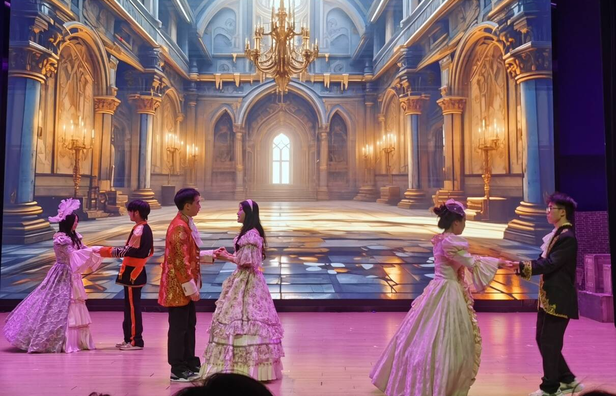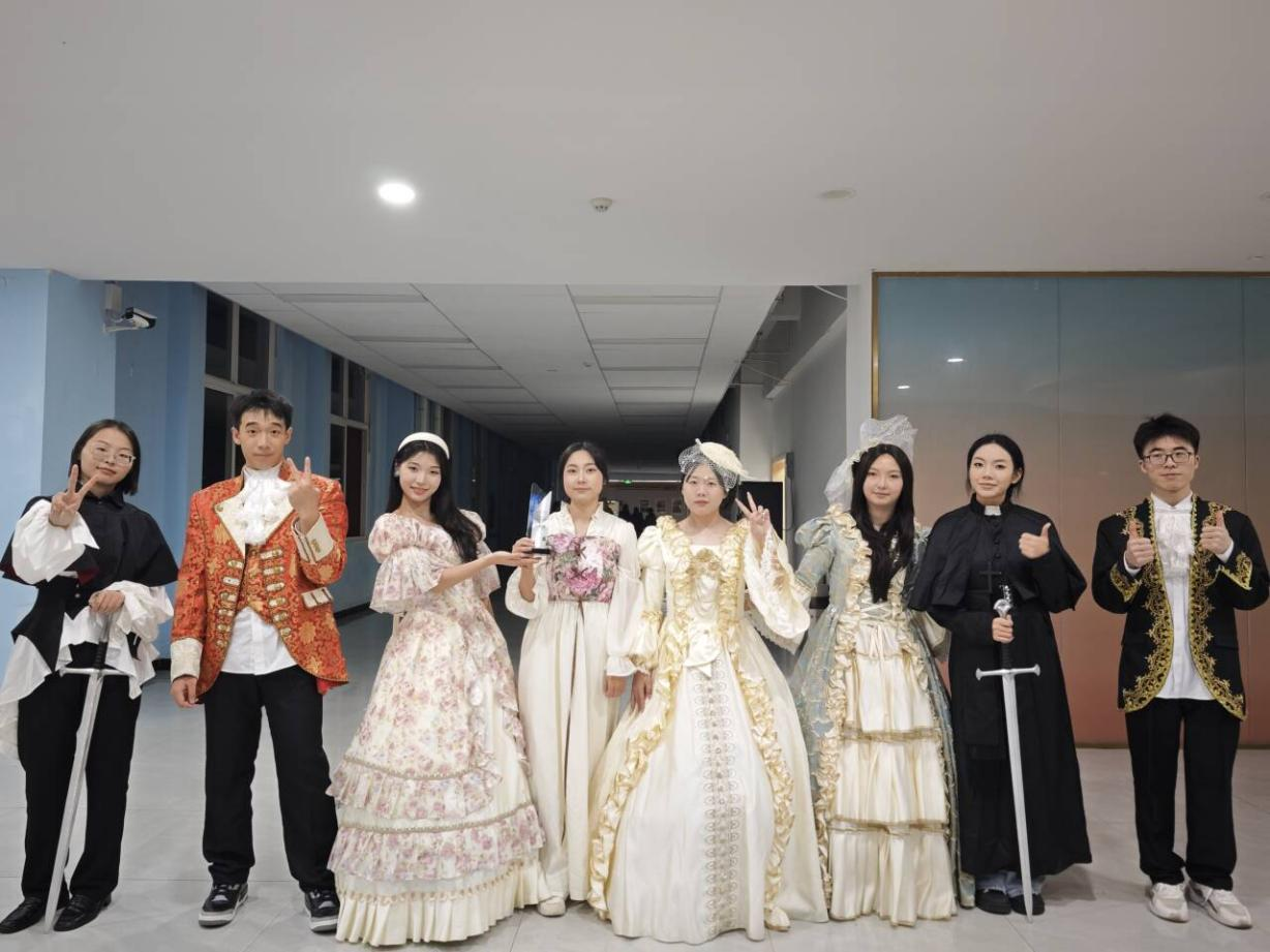 《罗密欧与朱丽叶》是此次展演中唯一的外语剧目,由舒正、谢路两位教师悉心指导,主要演员有梅琪、张文欣、陈睿恒、谢慧妍、黄宇、陈朝阳、汤欣茹、唐丽等同学。该剧以意大利维罗纳城作为故事背景,借助一对年轻恋人的爱情悲剧,深刻地揭示了封建家族仇恨对个人幸福的残酷戕害。此剧深入探究了爱情与家族仇恨、命运与个人意志之间的尖锐冲突,生动地彰显了人文主义对个性解放和自由恋爱的坚定追求。剧中对毒药、匕首等意象的精妙运用,进一步增强了悲剧色彩,而经典的阳台场景更是成为爱情与隔阂的典型象征。值得一提的是,剧中两个年轻生命的消逝并非意味着全然的毁灭。相反,他们的牺牲促成了两个世仇家族的和解与新生,传达出“爱与理解终将化解仇恨,引领人们迈向光明”的深刻主旨。