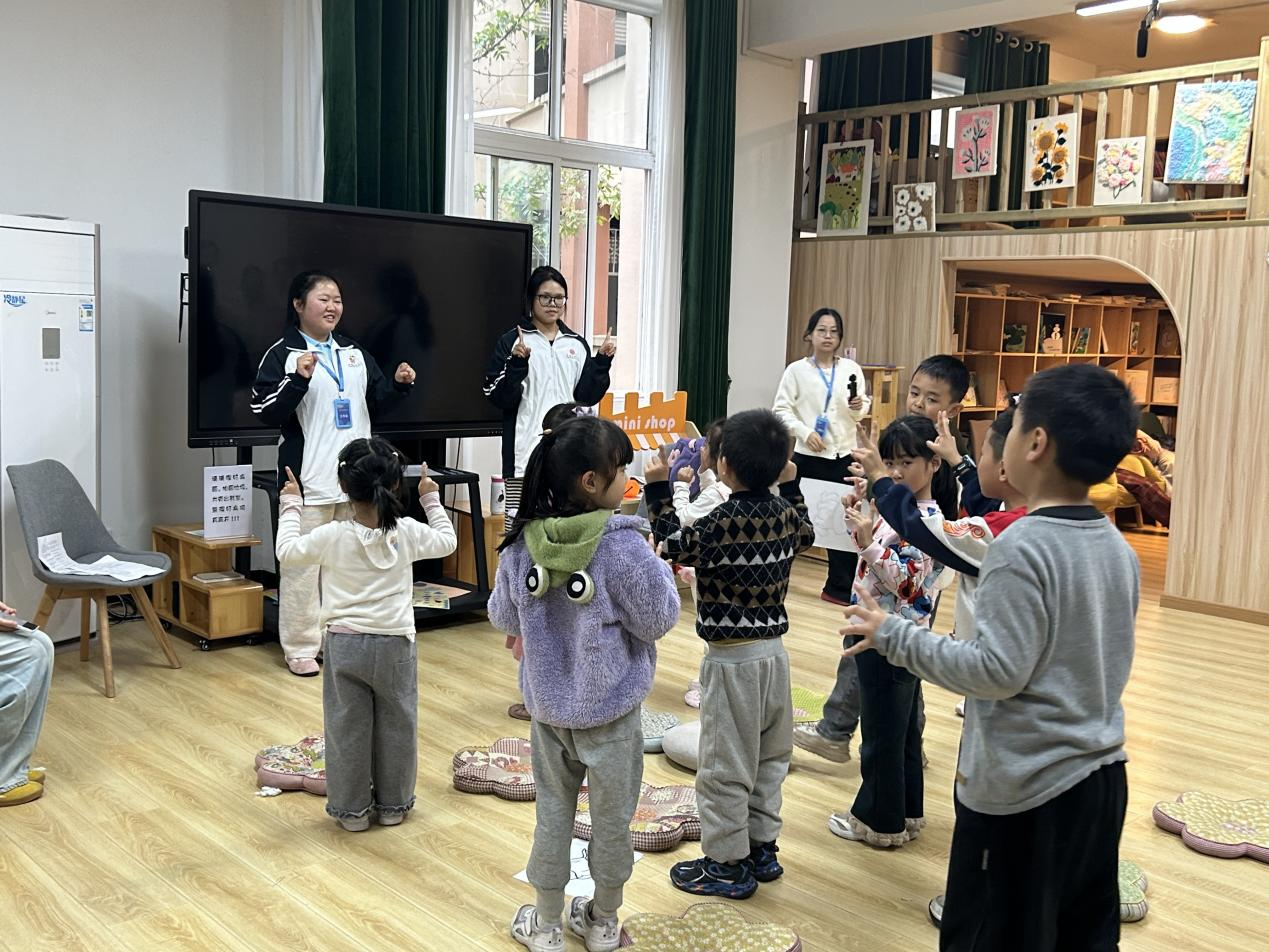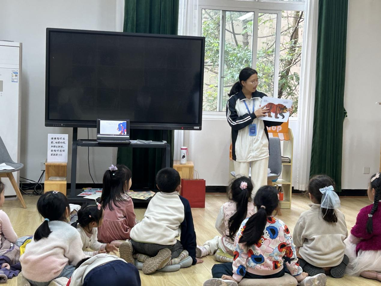 活动伊始,教育学院同学通过生动的讲述与情景演绎,带领孩子们走进多彩的绘本世界,激发阅读兴趣。现场组织的“萝卜蹲”“桃花开”等经典互动游戏,孩子们踊跃参与,笑声此起彼伏。外国语学院同学对绘本故事进行了生动演绎,通过角色扮演、英文儿歌等表演形式,将书中的情境搬上小舞台,让小朋友们对绘本内容有了立体的感知。