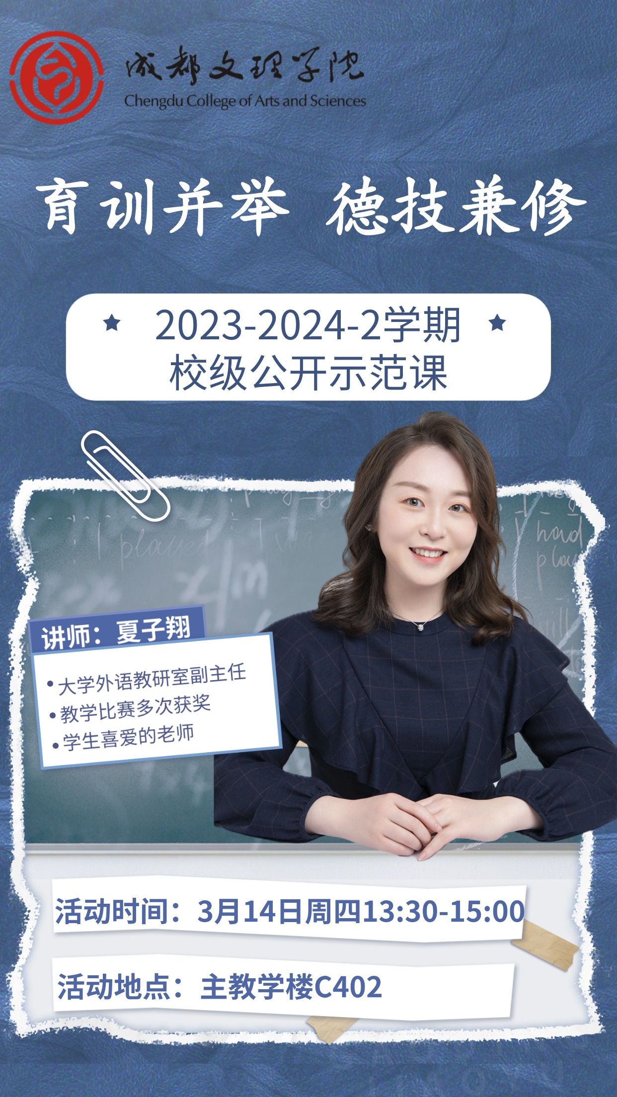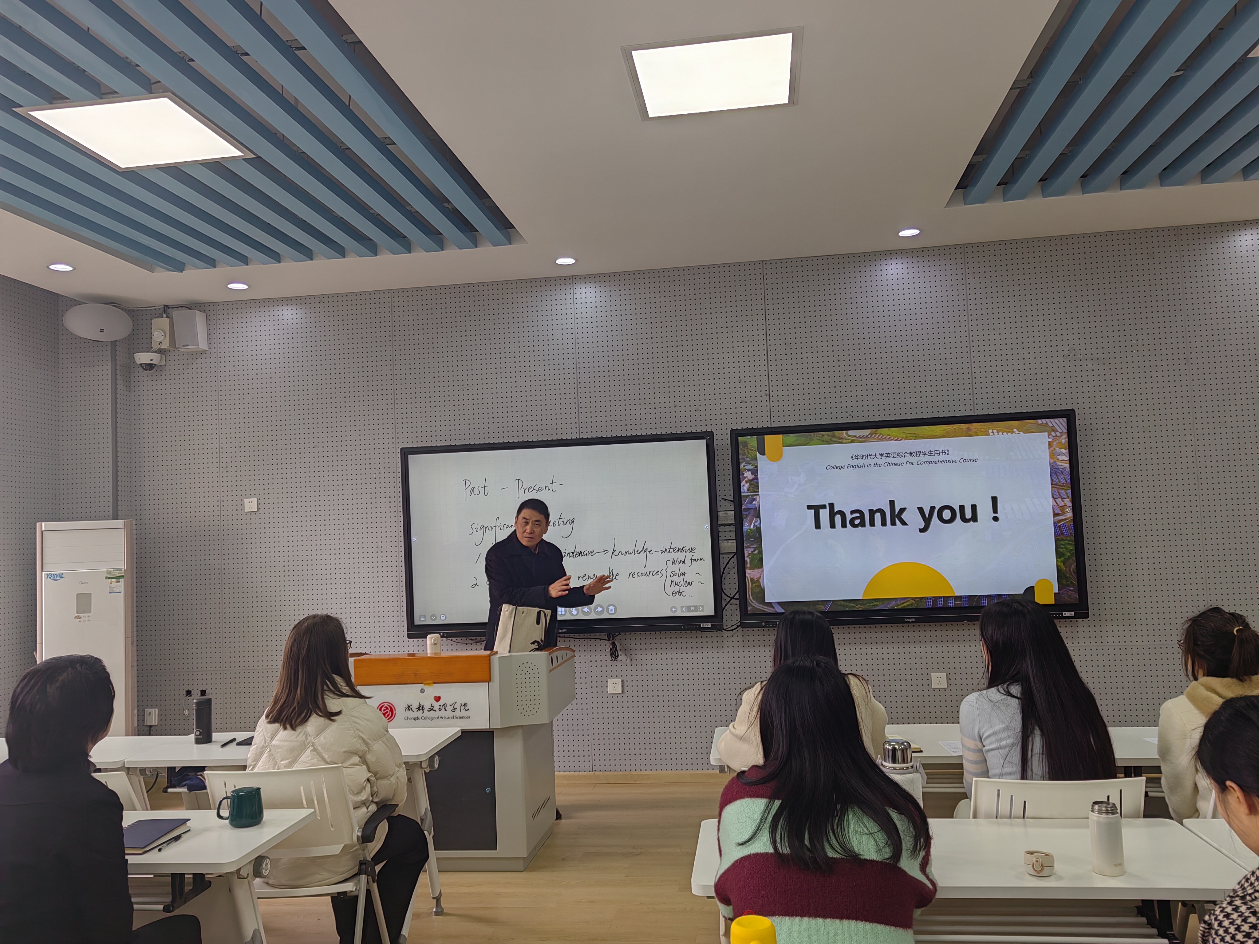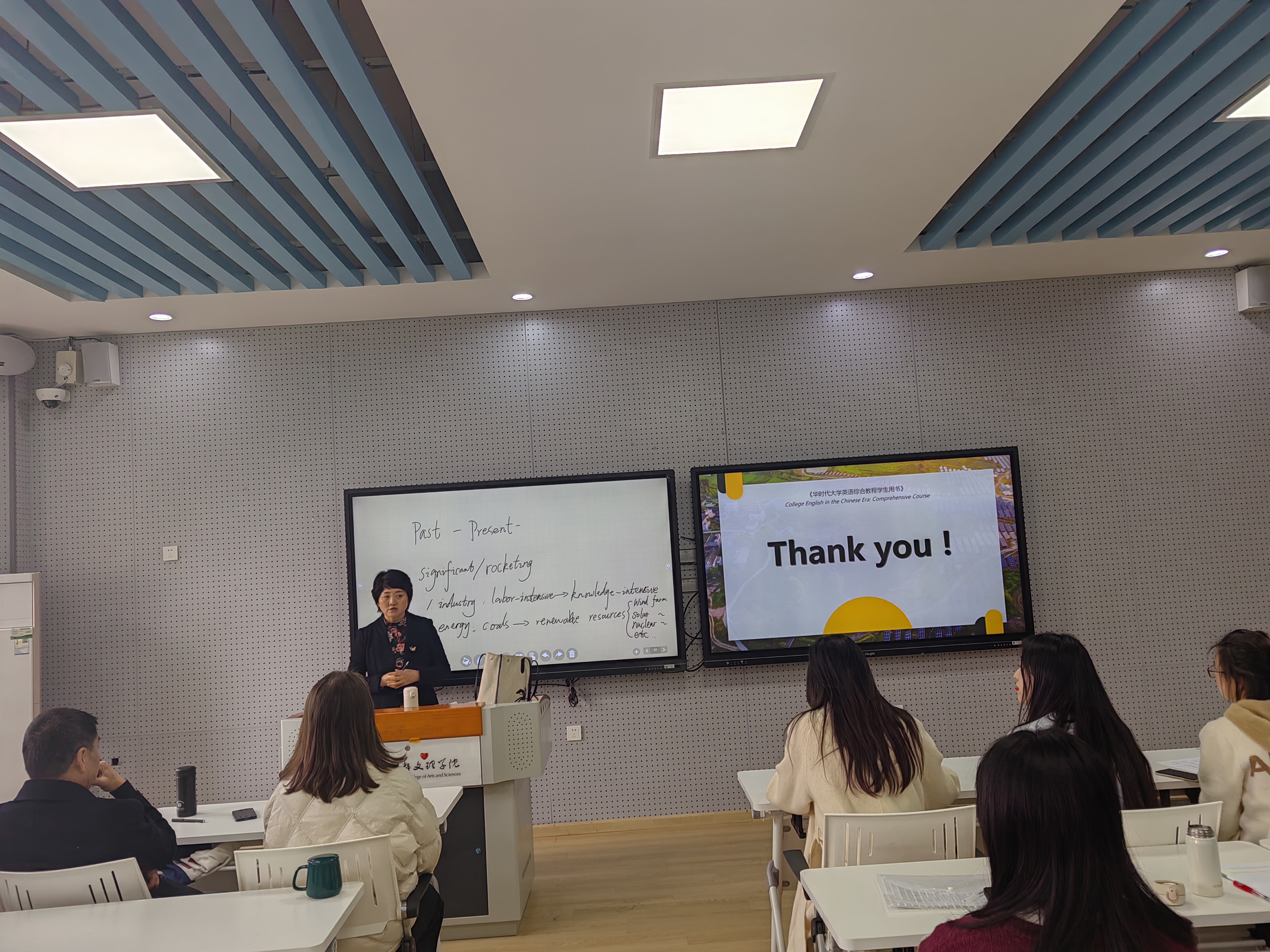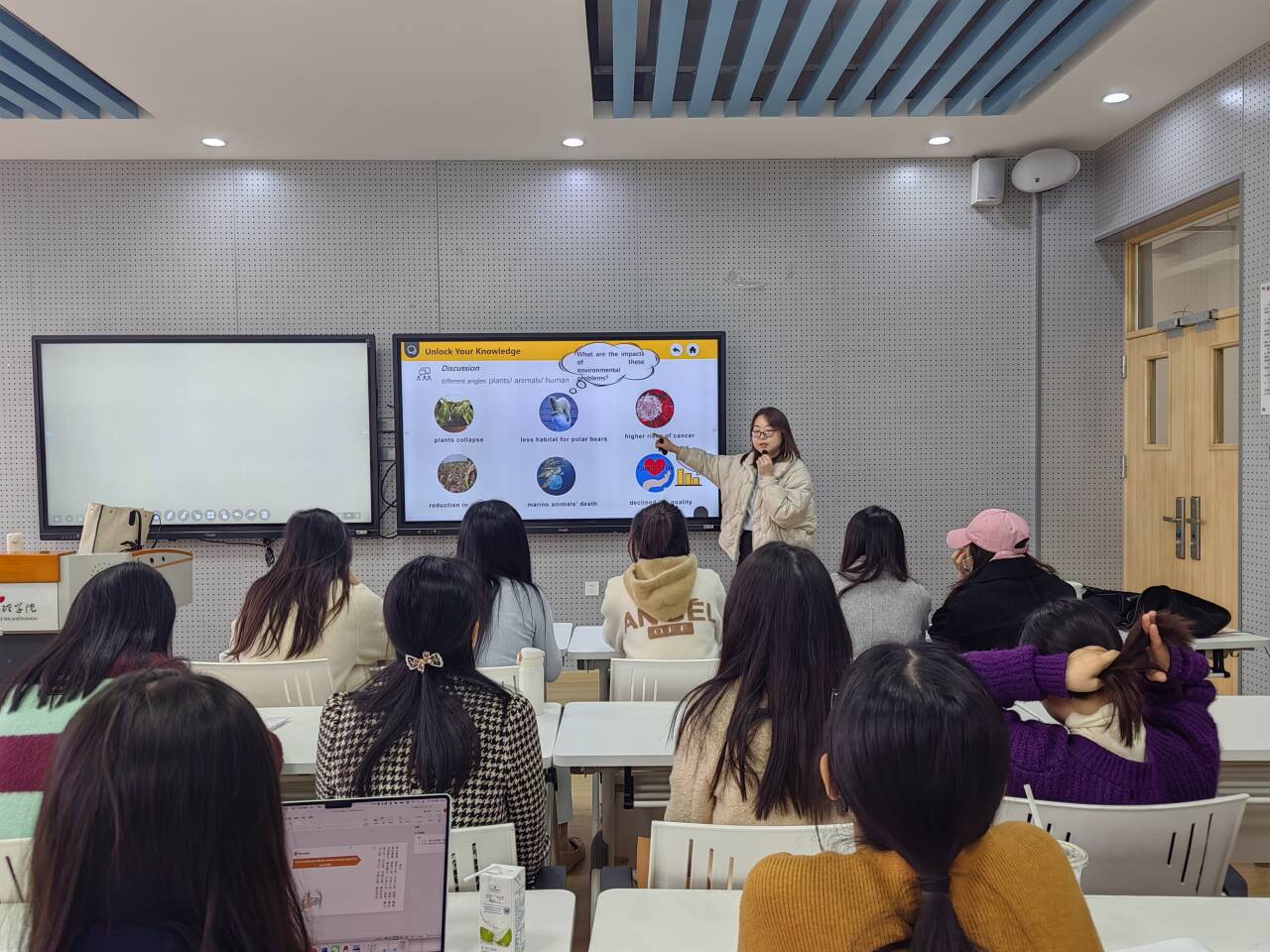 2024年3月14日下午在主教学楼C402,外国语学院开展了2023-2024学年度第2学期首次校级公开示范课分享会,主讲人为外国语学院大外英语教研室副主任夏子翔老师。她就《大学英语II》第4单元 Environment 第1课时的内容进行了精彩展示。校级督导马力教授、何涛教授,外国语学院院长王维民教授以及外国语学院20多名教师代表到场观摩。