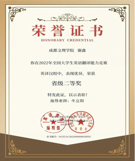 近日,由商务印书馆《英语世界》杂志社主办、广东省高教外语研究院、英文巴士、大学生英语赛事、中国英语教育研究网协办的2022年全国大学生英语翻译能力竞赛获奖名单揭晓,外国语学院教师牛立阳指导的2021级英语专业学生谢鑫同学荣获四川省英译汉组二等奖。