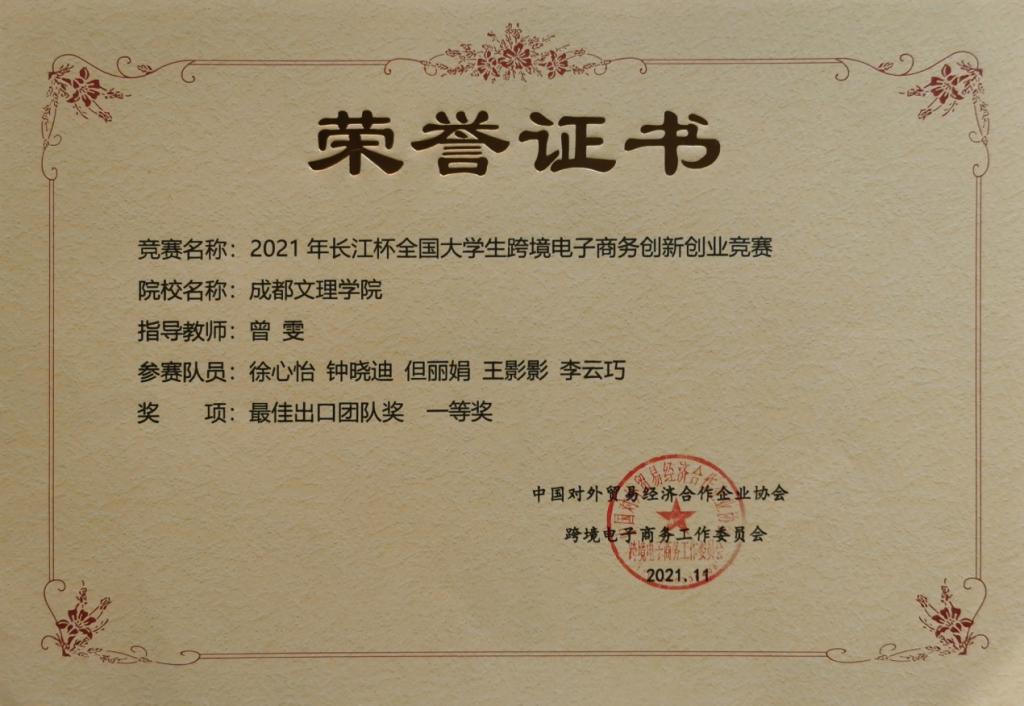 我校商务英语专业徐心怡、钟晓迪、但丽娟、王影影、李云巧五位同学在初赛和复赛阶段均表现优异,以出口第一的好成绩获得最佳出口团队奖一等奖的好成绩,展现出优秀的跨境商务实操技能和团队合作。在比赛总结中参赛选手写道:“复赛阶段的出口对象为泰国顾客,语言不通这对我们的比赛开展带来了巨大困难。从一开始的一筹莫展到后来的渐入佳境,都离不开整个团队的共同努力和曾雯老师的指导。我们在网上查阅相关资料,学习网课,确定了店铺发展方向和创新点,并制定了店铺装饰计划和一系列售后服务计划。”