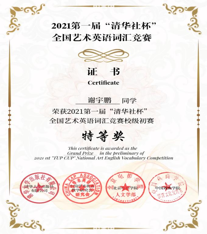 本次大赛参赛对象为全国艺术类院校在读的艺术类专业大学生,采取线上参赛方式,由清华社外语在线平台提供技术支持。经艺术类教研室通知宣传和学生自愿的原则,共有119名学生报名参加考试,比赛结束后,参赛者的得分和排名由系统自动产生,若出现相同成绩时,系统将依据答题时长确定排名先后。我校共有62位同学获奖,其中谢宇鹏、林洁、牟文丽、缪娇、唐敏五位同学获校级特等奖,张曼琪、金一璇、赵莼雨、唐靖然、王鑫悦、秦嘉利六位同学获校级一等奖,王天乐等17为同学获校级二等奖,王思缤等34位同学获三等奖。