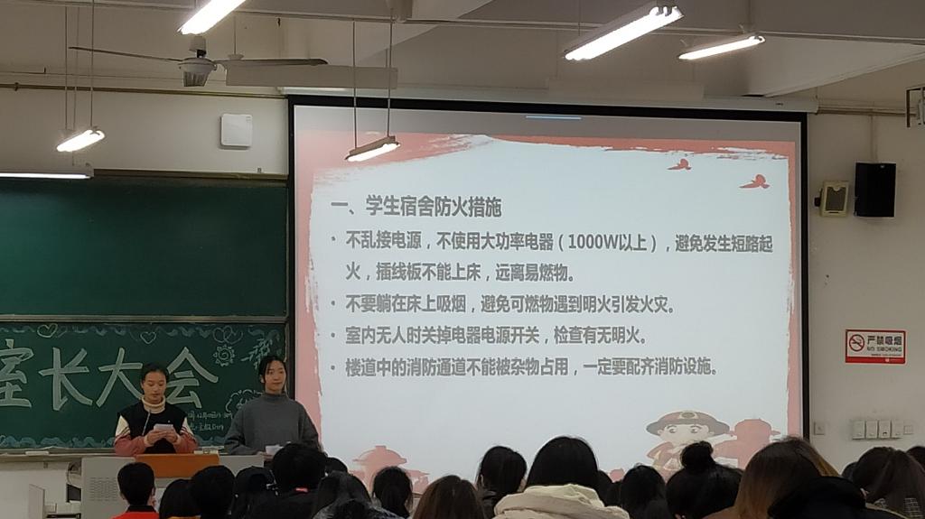 在冬季消防安全教育环节,外国语学院自律委员会学生干部围绕学生宿舍消防安全、教室图书馆消防安全、外出交通安全等方面进行详细地宣讲,引导与会寝室长要紧绷消防安全这根弦,站好宿舍安全监督岗。