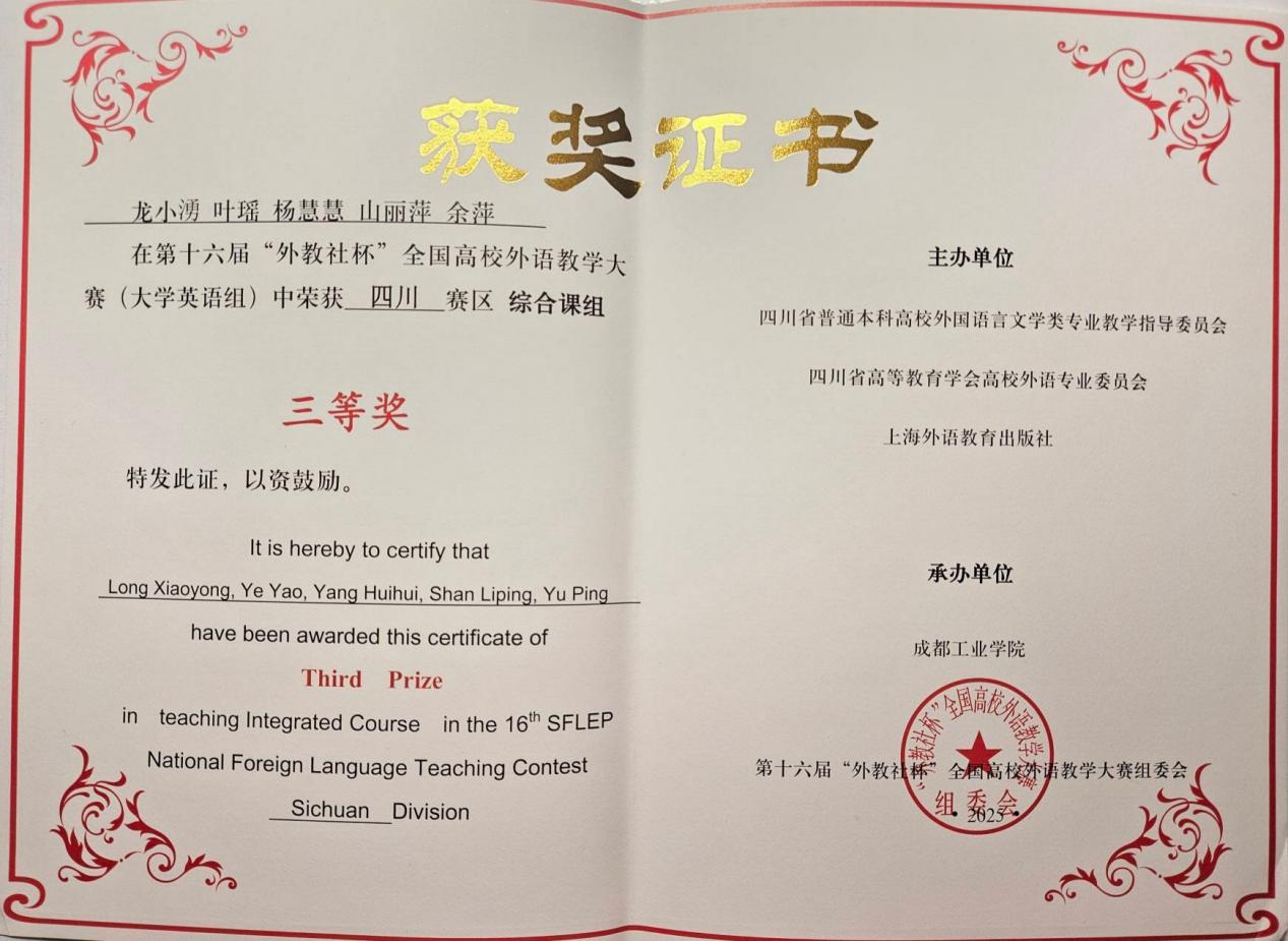 近日,第十六届“外教社杯”全国高校外语教学大赛(大学英语组)圆满落幕。外国语学院大学外语教研室龙小湧老师带领的参赛团队(龙小湧、叶瑶、杨慧慧、山丽萍、余萍)凭借出色的教学设计与精彩的说课、讲课表现,荣获四川赛区综合课组三等奖。