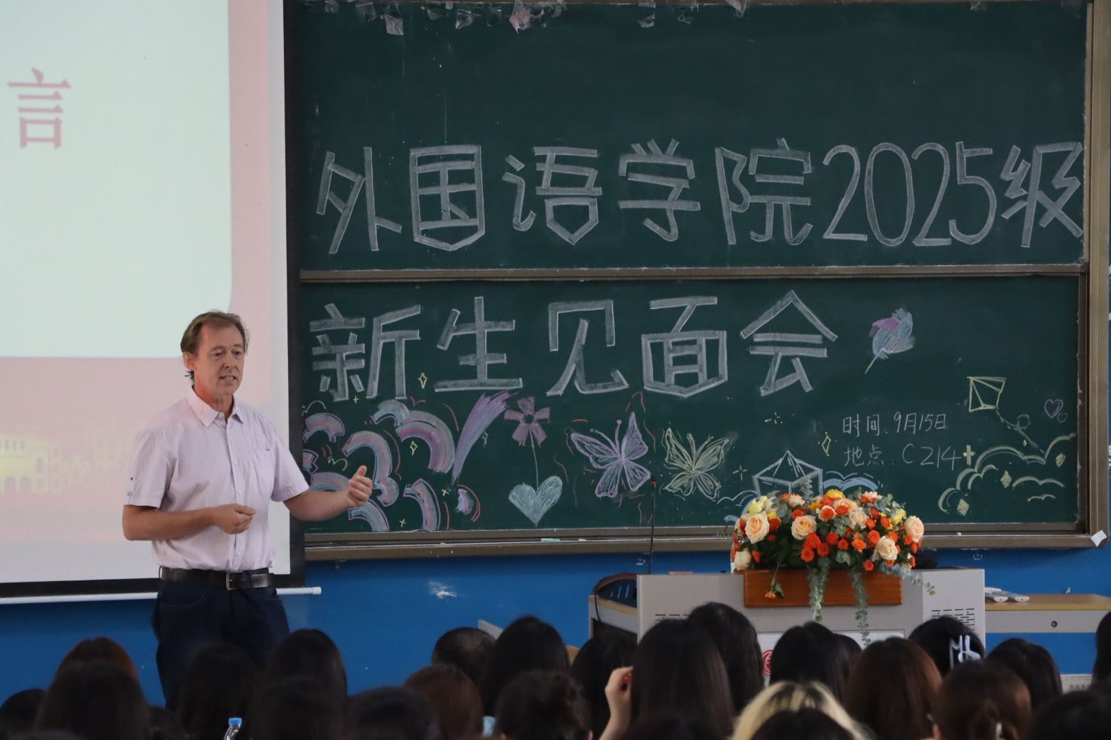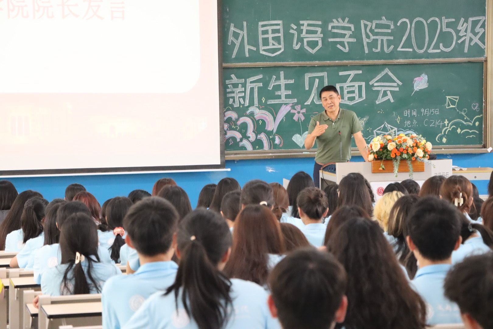 9月15日下午,外国语学院于主教学楼C214教室举行了2025级新生开学典礼暨新生见面会。外国语学院院长王维民、学院党委副书记苏凌函、院长助理雷婕、余霞,学工办主任徐杏,外籍教师Mark Swart,英语专业教研室主任,辅导员等教职工代表,以及2025级本、专科全体新生出席了见面会。见面会由黄韵颖老师双语主持 。