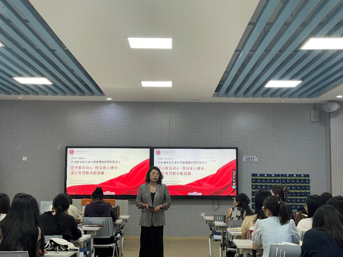 秋高气爽,天朗气清,踏着秋日的暖阳,新一学期已然拉开序幕。为积极应对新学期新面貌,全面提升教师教学质量与师德素养, 9 月 24 日外国语学院大学外语教研室举办了“坚守教育初心,担当育人使命:谱写英语教学新篇章”的师德师风专题学习。活动由外国语学院院长助理雷婕老师主讲,全体大学外语教研室教师出席,共同探索新学期教学师风新方法与新路径,共筑师德师风根基。