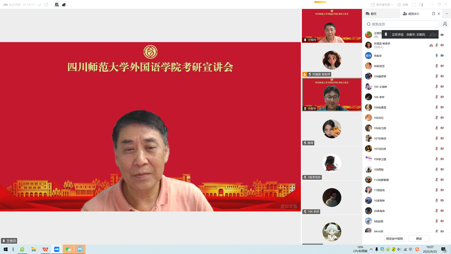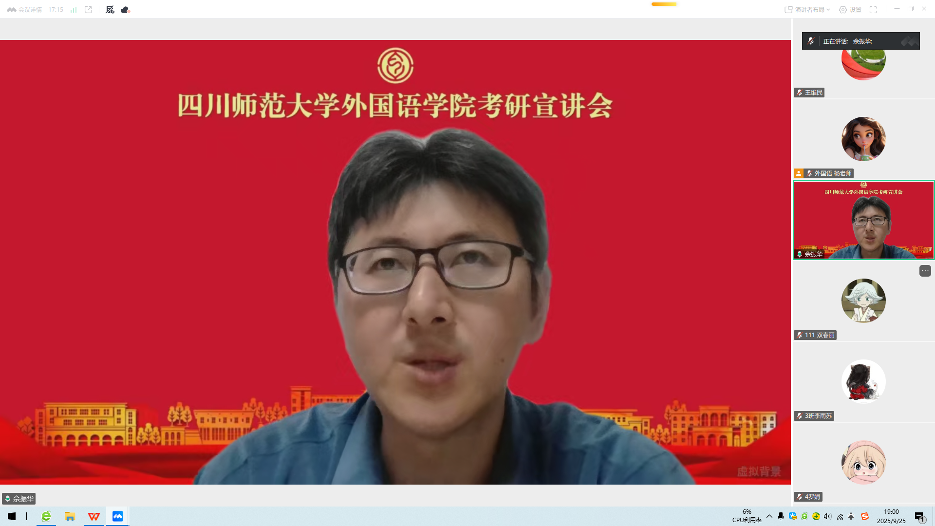9月25日晚7:00,我院邀请四川师范大学外国语学院副院长佘振华教授为我院学子举行了一场线上考研讲座。外国语学院70余名同学聆听了讲座,外国语学院院长王维民、院长助理余霞等教师也参加了讲座。讲座由院长王维民主持。