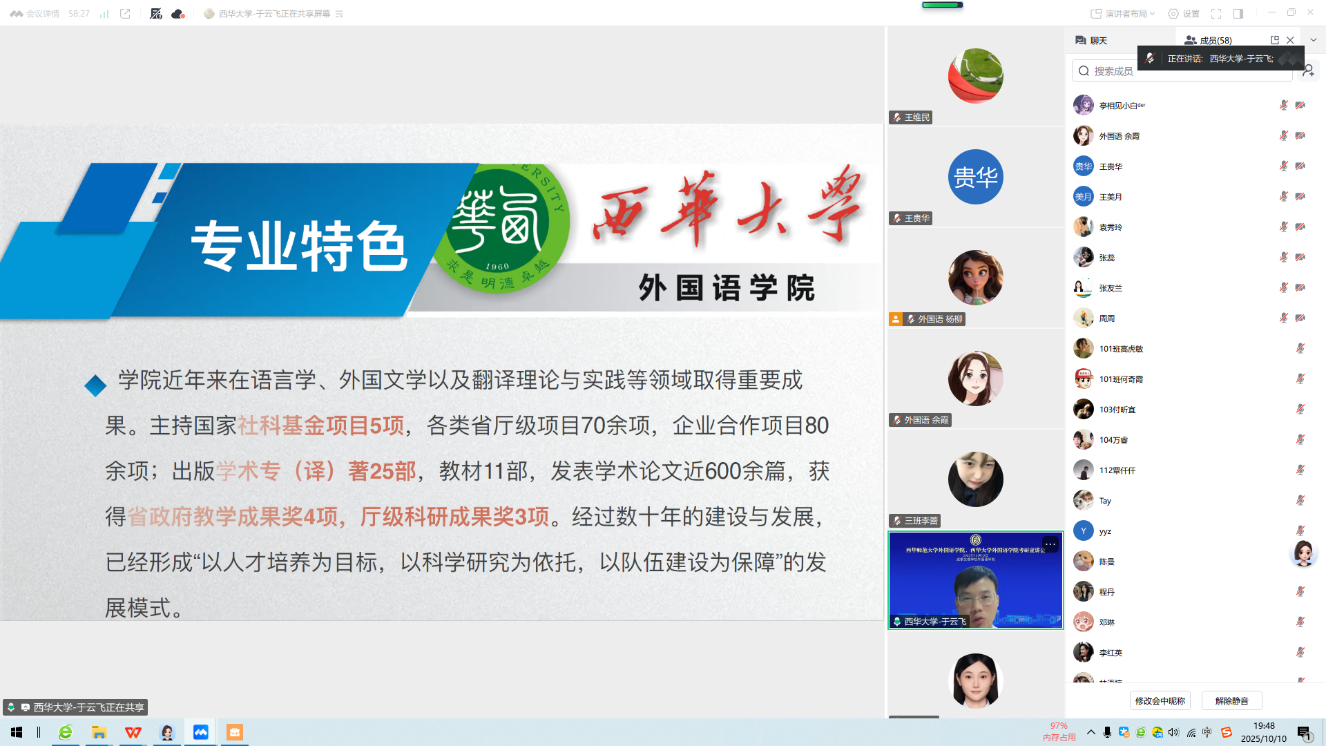 10月10日晚7点,外国语学院和新视域文化产业学院共同举办了线上考研宣讲会。本次活动邀请到了西华师范大学外国语学院和西华大学外国语学院为我院考研学子举行了线上考研宣讲。外国语学院院长王维民、院长助理余霞、办公室杨柳老师及我院60余名学子参加了宣讲。宣讲会分别由王维民和余霞主持。