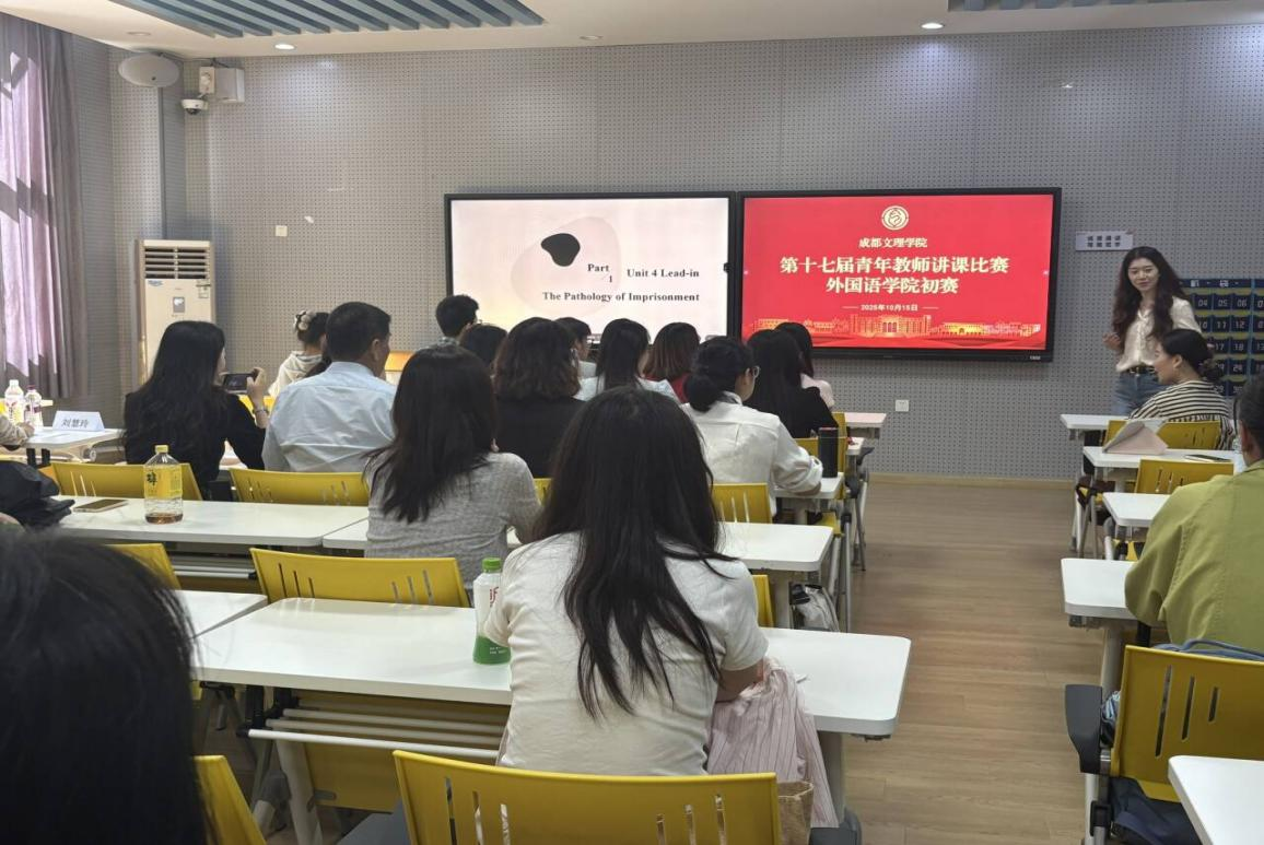 2025年10月15日下午在主教学楼C301教室,成都文理学院外国语学院与新视域文化产业学院共同举办了第十七届青年教师讲课比赛院级选拔赛。