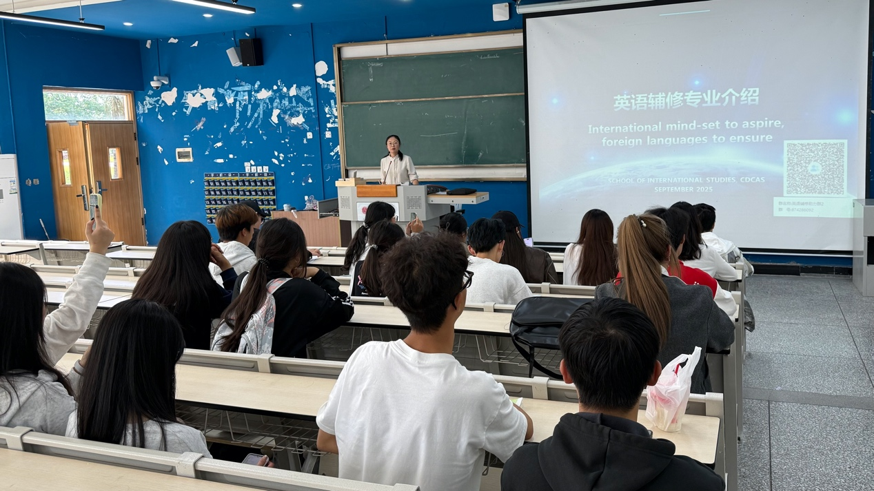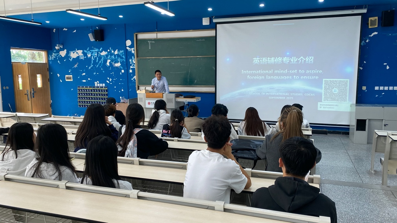 2025年10 月15 日中午12:30,外国语学院与新视域文化产业学院在D114 教室共同举行了第二次英语辅修专业宣讲会。本次宣讲会英语专业教研室副主任(主持工作)周倩主持,王维民院长亲临现场致辞,为学生解析英语辅修的价值与优势。