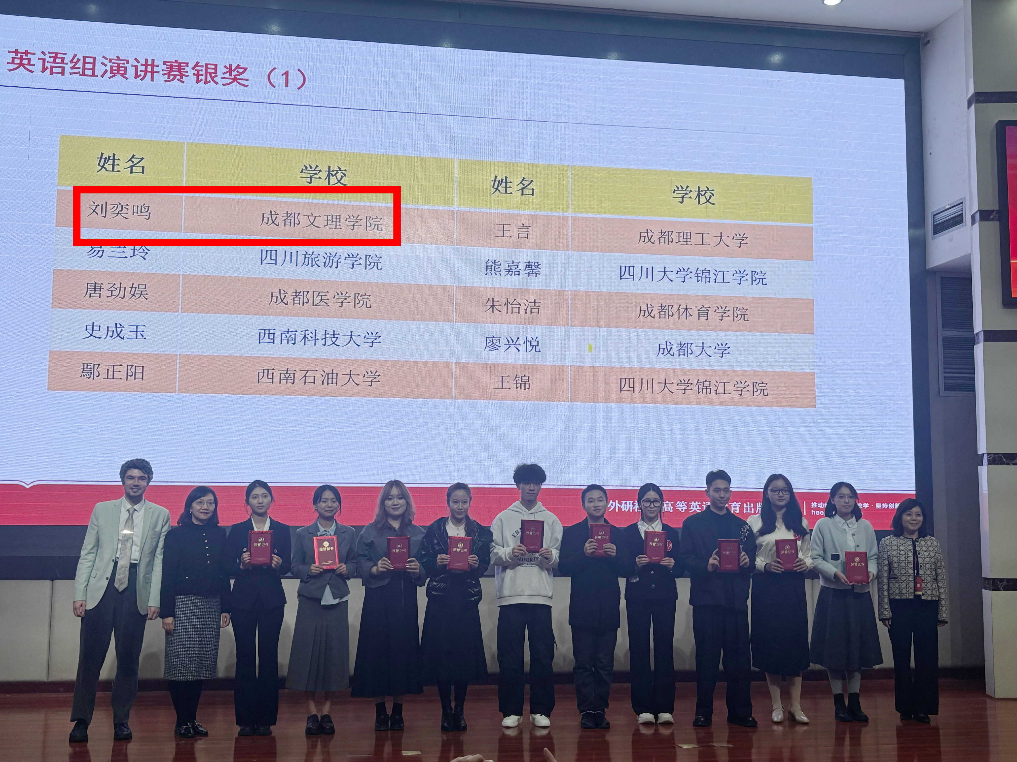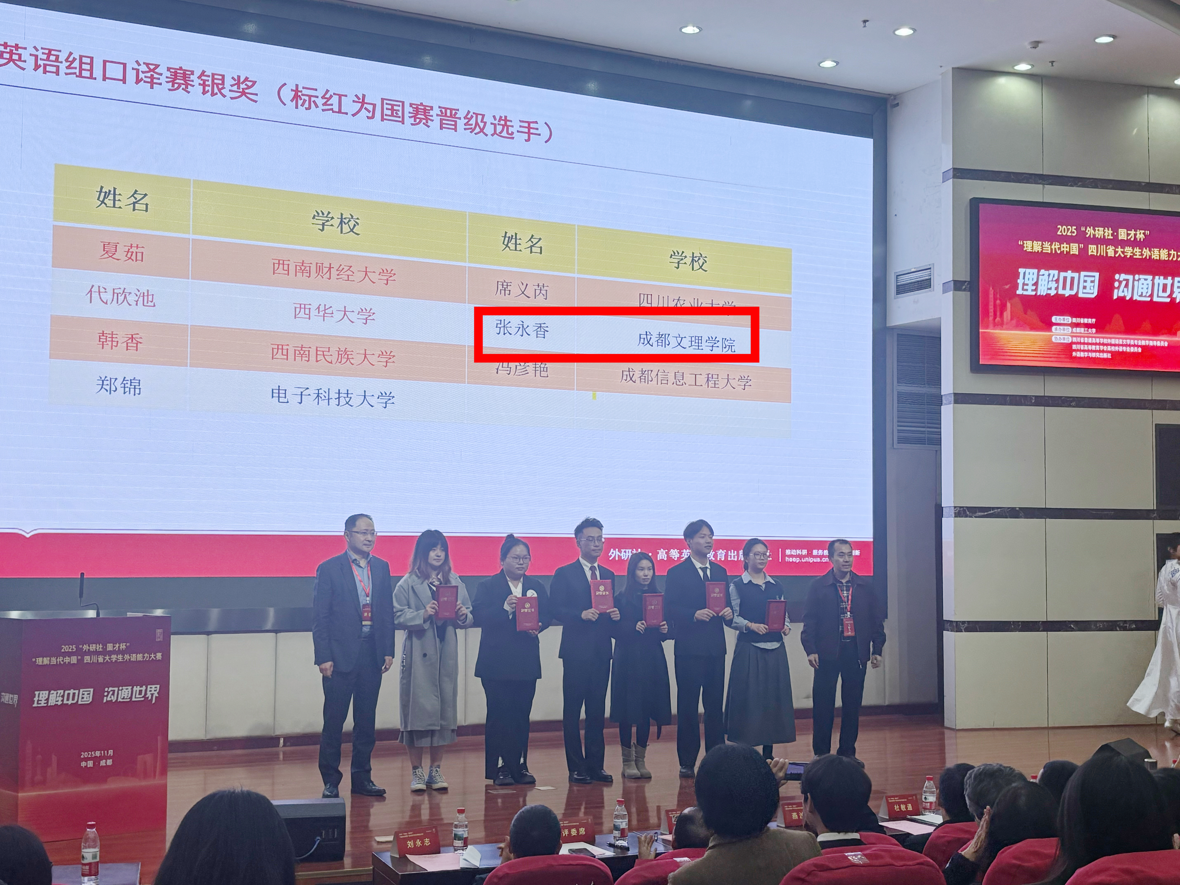 11月2日,2025年“外研社·国才杯”“理解当代中国”四川省大学生外语能力大赛在成都理工大学圆满落幕。在与全省各高校百余名学生同台竞技中,我校选手沉着应战,荣获两银四铜的优异成绩。其中,英语专业刘奕鸣获英语演讲比赛银奖,英语专业张永香获英语口译比赛银奖;英语专业谭宏嘉、张渝源、蒋雪玲以及法学专业赵心琛四位同学在综合能力比赛中荣获铜奖。