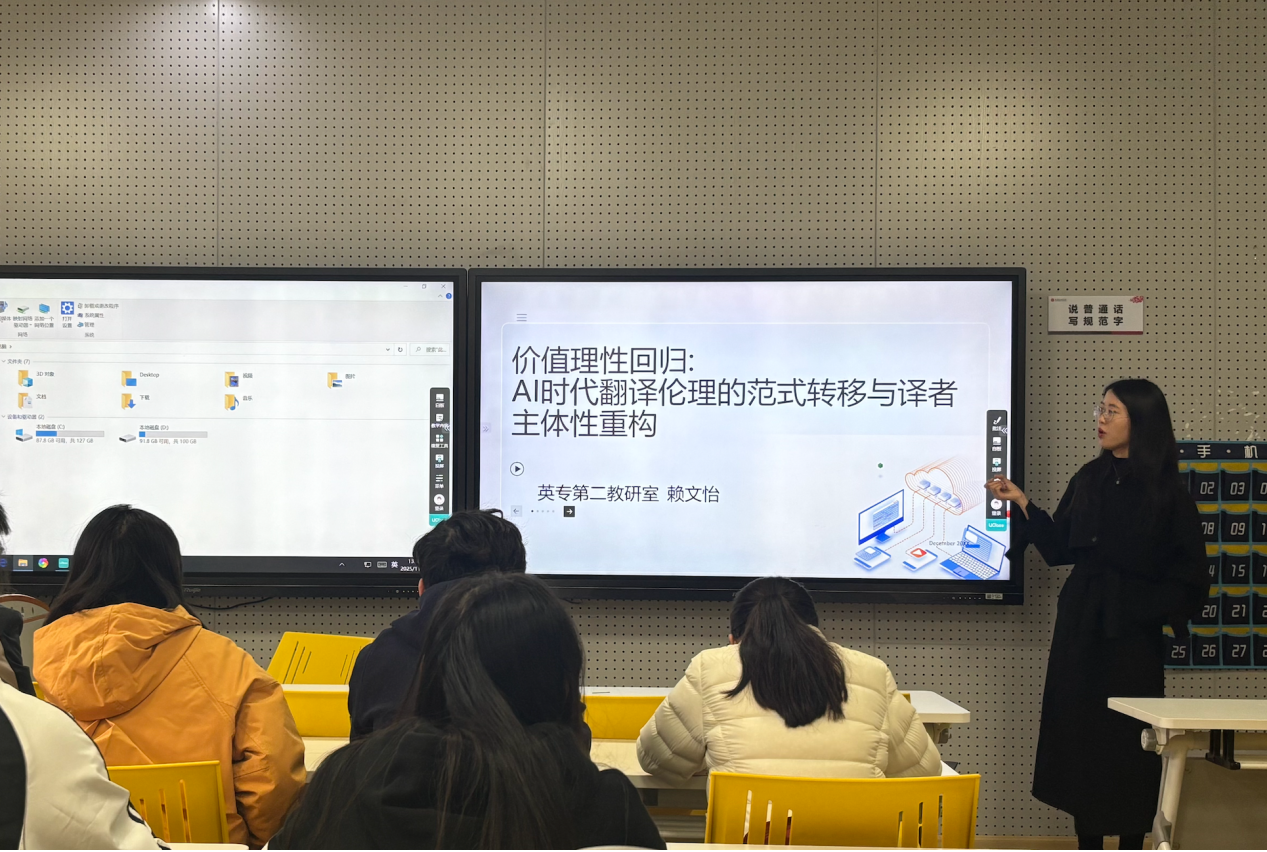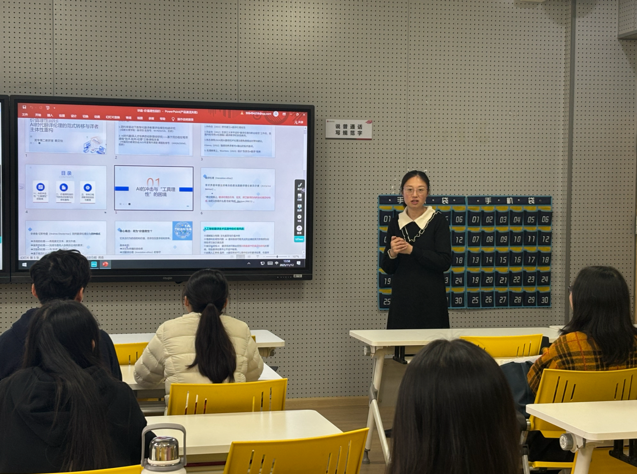 11月12日下午13:30-15:30,英语专业第二教研室于主教学楼C302开展了题为“价值理性回归:AI时代翻译伦理的范式转移与译者主体性重构”的学术讲座,由为赖文怡老师主讲,讲座吸引了众多教师及学生参加,取得了良好的效果。