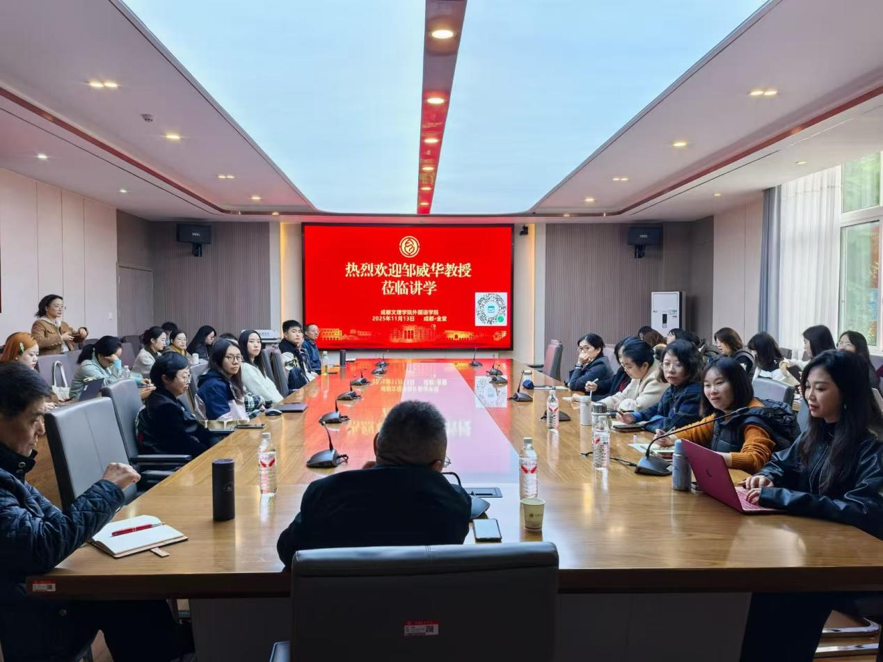 2025年11月13日下午,外国语学院在主教学楼第二会议室成功举办 “外国语言文学类科研选题与高级别项目申报”专题讲座。本次讲座特邀文学博士、硕士生导师、四川省应用外语研究会副会长、国家级一流本科专业负责人邹威华教授担任主讲。外国语学院院长王维民,科研处主管吴娟及外国语学院全体专职教师出席了讲座,讲座由院长助理余霞主持。