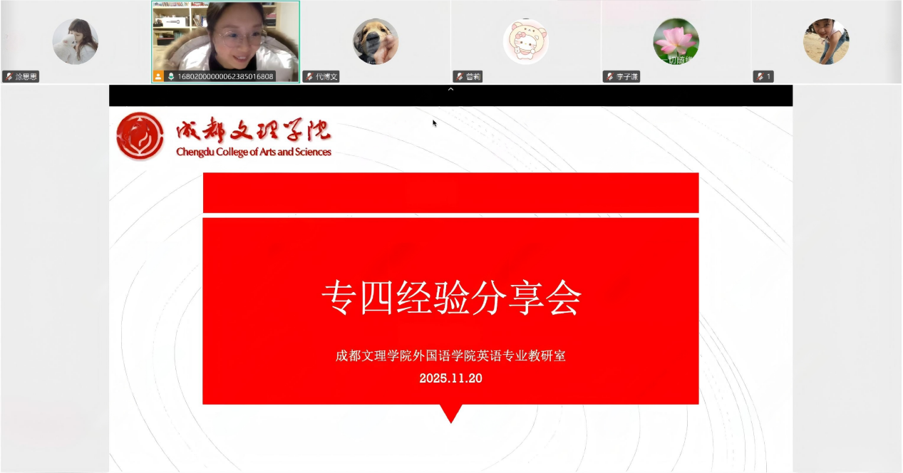 为帮助英语专业学生明确学习方向、科学备考专业英语四级考试,2025年11月20日晚,外国语学院英语专业教研室在线上举办了“专四备考经验分享会。会议由英语专业第二教研室副主任(主持工作)周倩主持,23级优秀学生、专四高分得主谭宏嘉和包丹丹担任分享嘉宾,全体英语专业学生在线参与。