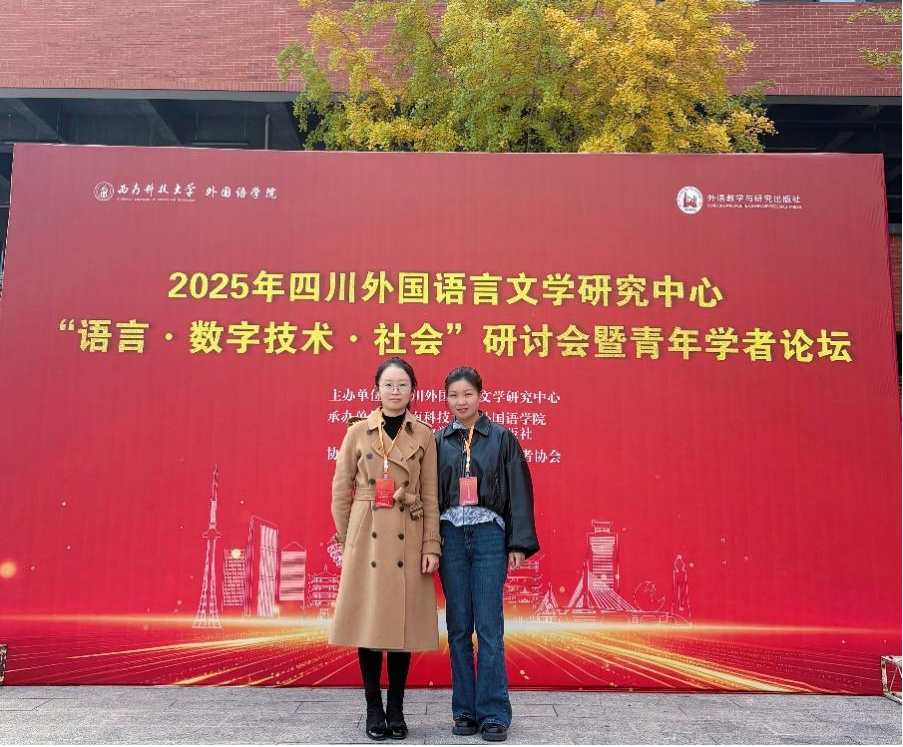2025年11月21日至11月23日,由四川外国语言文学研究中心主办、西南科技大学外国语学院和外语教学与研究出版社共同承办的“语言·数字技术·社会学术研讨会暨2025年青年学者论坛”在绵阳举办。我校外国语学院教师赵雪梅、钟悦欣因论文入选,受邀出席本次研讨会。