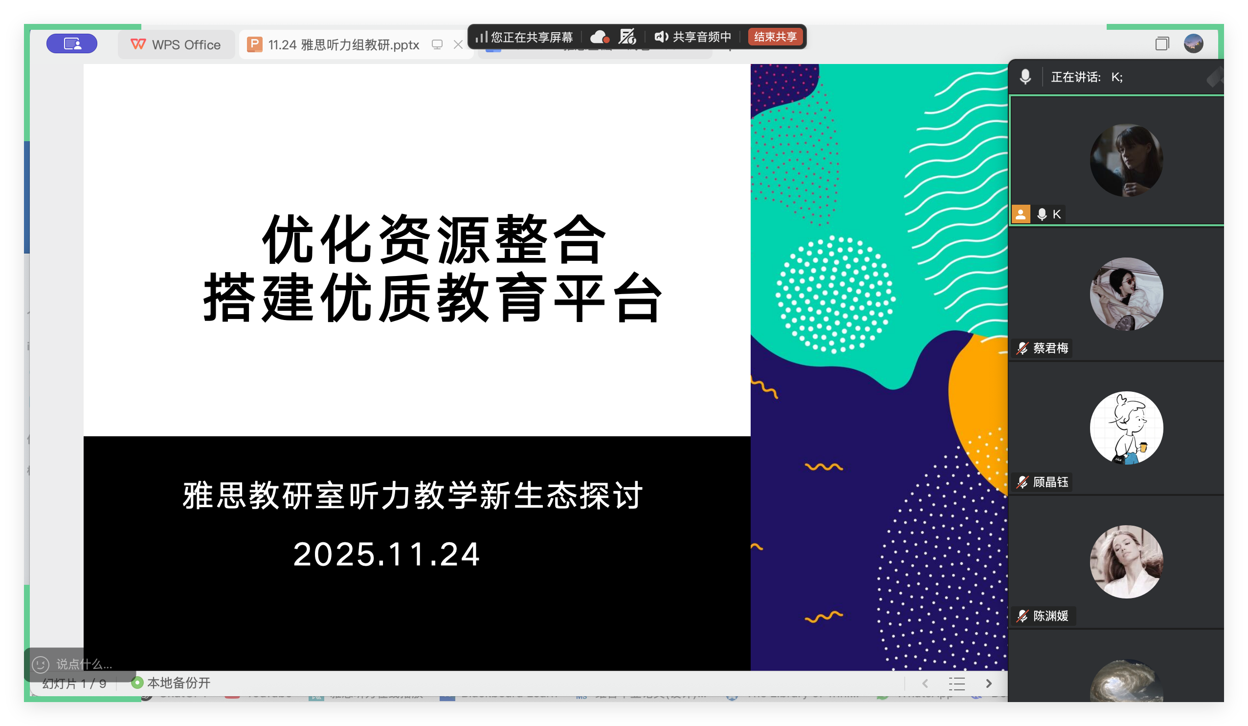 为深入推进优化资源整合,搭建优质教育平台的理念,精准提升雅思听力教学效能,兼顾多层次学习需求,11 月 24 日,外国语学院雅思教研室听力组召开线上专题教研会。会议由听力组组长曾嘉涵主持,听力组全体成员参加。