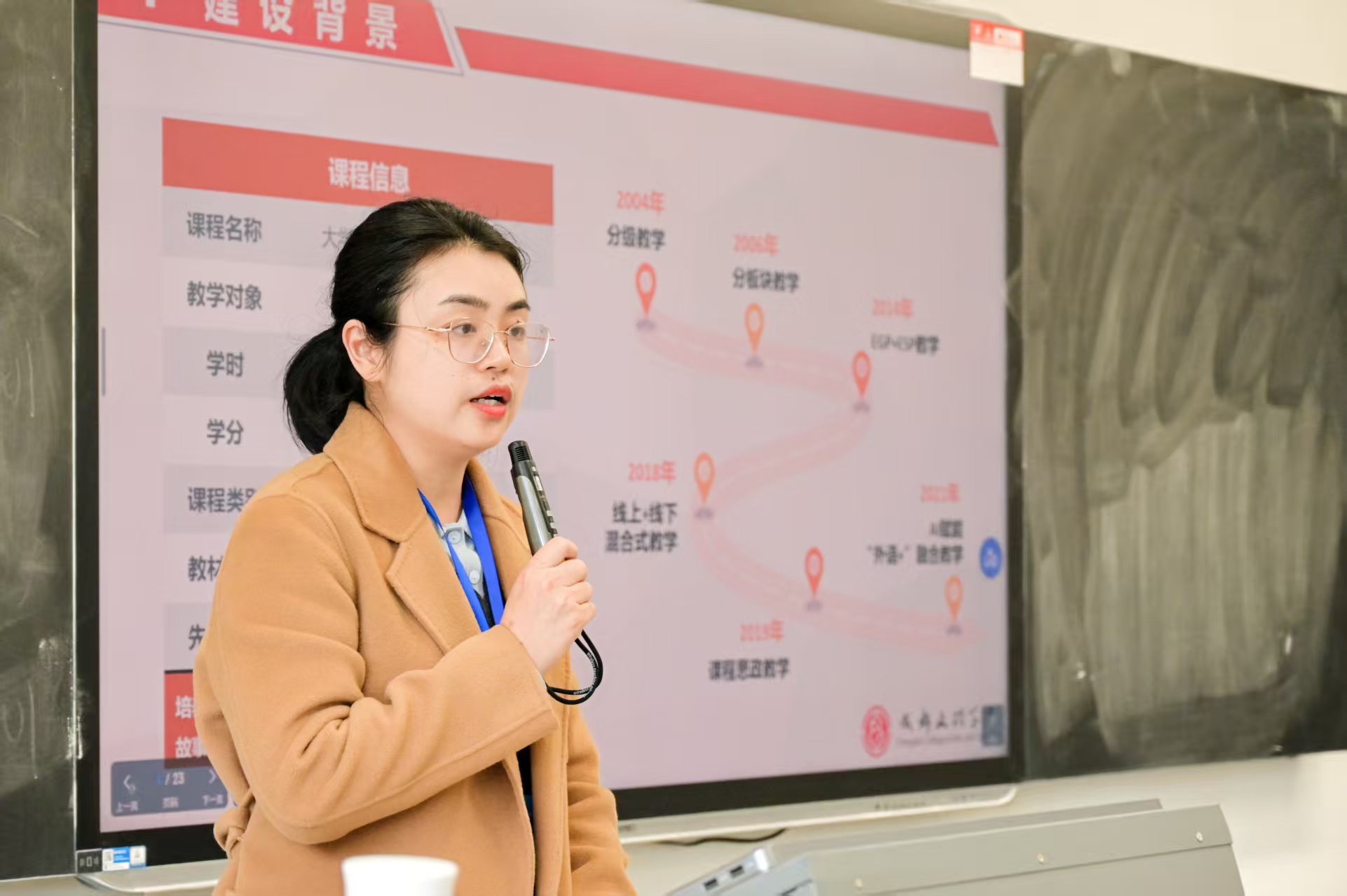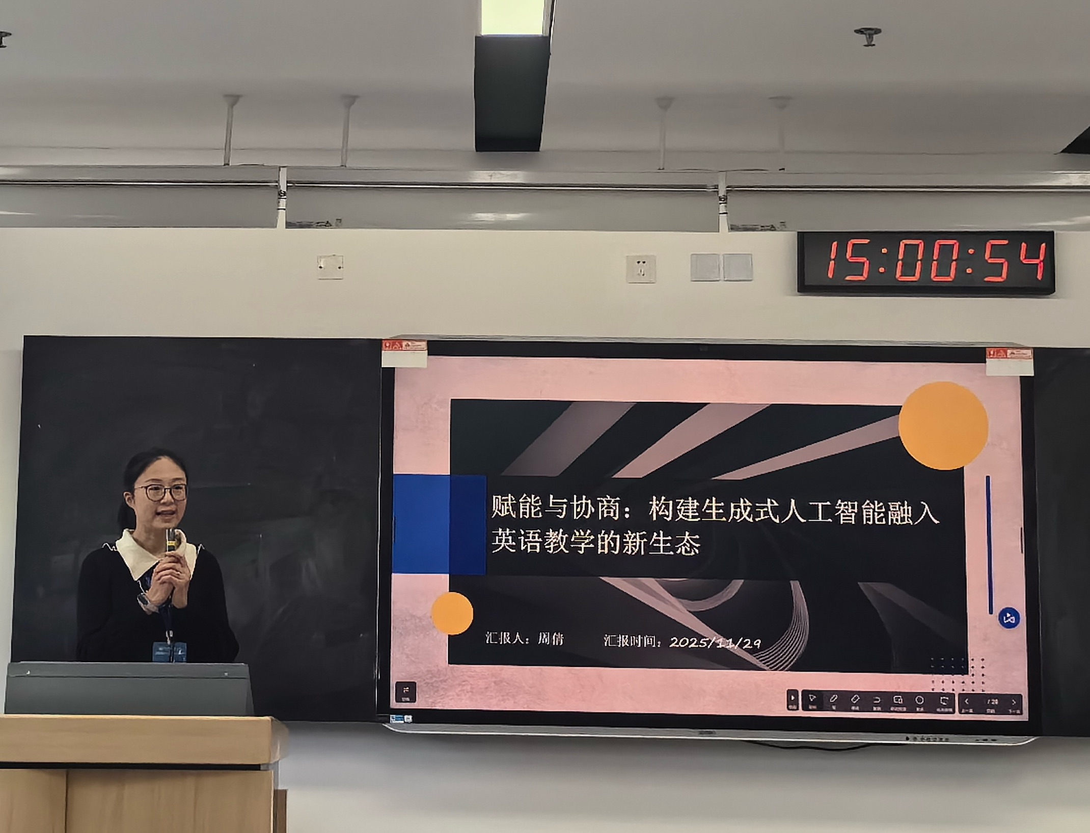 李芍、周倩、曾雯三位老师分别在分会场进行了论文宣读。李芍老师探讨了人工智能与大学英语教学的深度融合。她针对当前教学的痛点,构建了一个以“AI赋能”为核心的“四维四阶”教学新范式。该范式系统性地重构了教学目标、内容、模式与评价,旨在将语言课程提升为培养学生跨文化沟通、数字创新等复合型能力的平台。周倩老师则深入研究了生成式人工智能在教学中的具体应用生态。她基于“人机互动协商能力”理论,将大语言模型视为“第三主体”,构建了涵盖备课、授课、评价、实践的四维教学框架,并通过《大学思辨英语教程·视听说》具体案例展示了如何实现有效的人机协同,推动教学从“知识传授”向“智慧赋能”转变。曾雯老师聚焦于政治话语的对外翻译。她通过分析习近平主席在大运会欢迎宴会上的致辞,阐述了排比、引用等修辞手法在增强感染力和传递文化内涵中的作用,指出译者遵循“政治等效+审美再现”原则,在确保政治意图准确传达的同时,最大限度地再现了源语的修辞魅力。