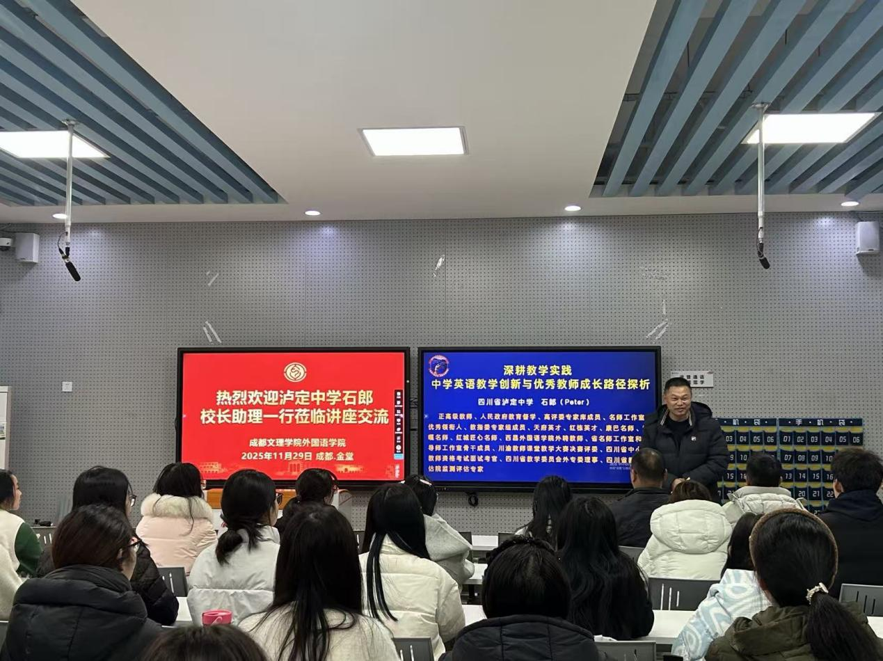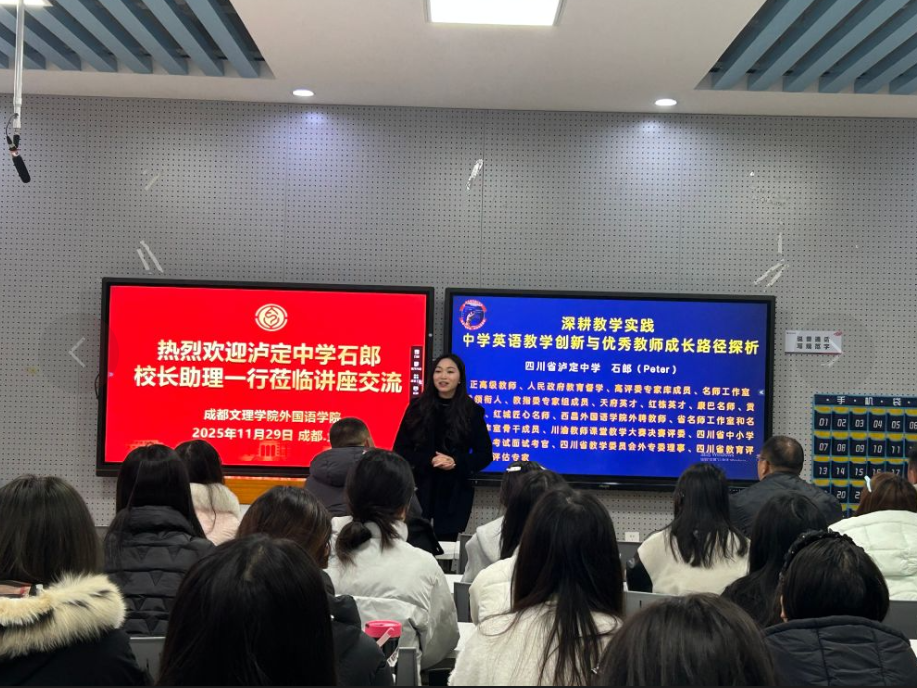 2025年11月29日上午,新视域文化产业学院和外国语学院邀请四川省泸定中学校长助理石郎在行政楼C203举办了一场主题为“有料、有笑、有脑:优秀中学英语教师的成长之道”的讲座。讲座由院长助理余霞主持,外国语学院英语(师范)专业同学参加。