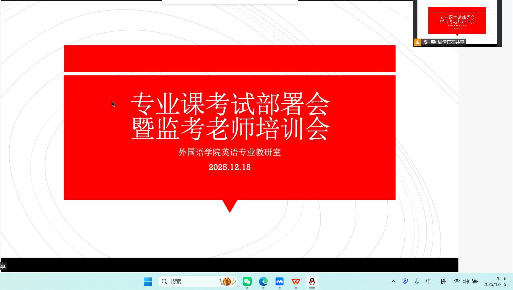 为规范期末考试组织,严肃考风考纪,确保期末教学工作顺利进行,2025年12月15日晚20:20,外国语学院在线上组织召开了英语专业2025-2026学年第一学期期末考试工作部署与监考培训会。会议由英语专业第二教研室主任周倩主持,外国语学院院长助理余霞、各教研室主任及英语专业全体教师参加了会议。
