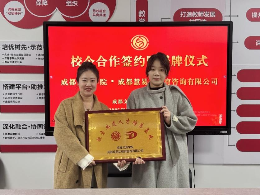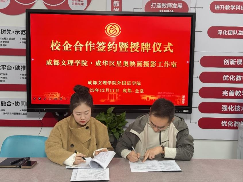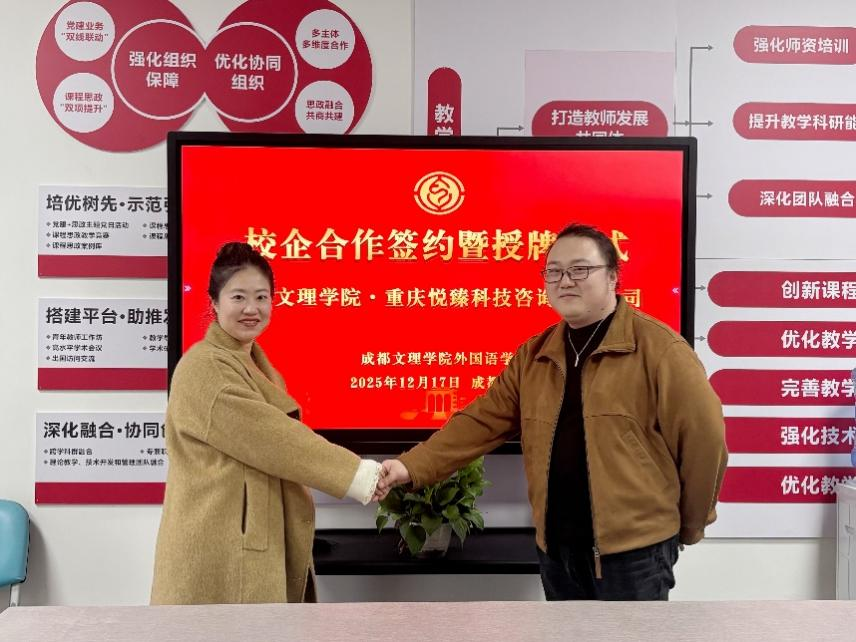 为深化产教融合、拓展学生实习实践和就业平台,12月17日,在成都文理学院新视域文化产业学院与外国语学院的邀请下,重庆悦臻科技咨询有限公司、慧易达教育咨询有限公司、成华区星奥映画摄影工作室三家企业到校与外国语学院学院校举行校企合作线下签约暨授牌仪式。外国语学院党委副书记苏凌函、院长助理雷婕、实习实践工作负责人潘巧出席仪式。