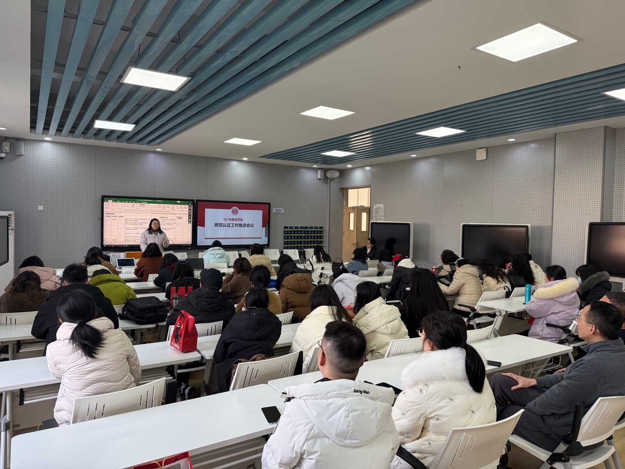 2026年1月13日下午1点,外国语学院英语专业教研室在主教C402召开师范认证工作总结暨期末工作部署会。院长助理余霞副教授、教研室主任、副主任、师范认证各工作组负责人及全体教师参会,会议全面梳理师范认证阶段性工作成效,总结本学期教学育人成果,明确后续工作方向与重点。