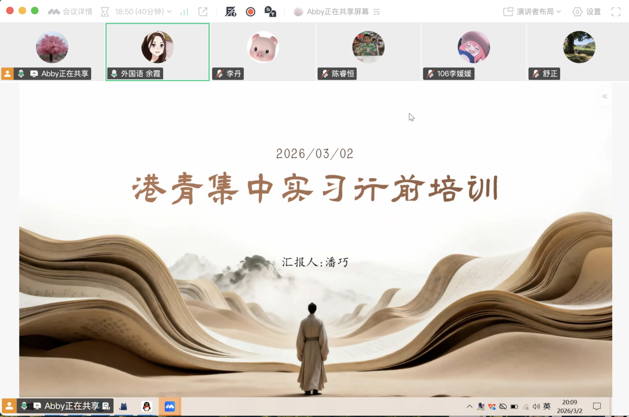 2026年3月2日晚,为进一步落实师范生实践教学环节,确保集中实习工作顺利开展,外国语学院线上召开了师范生赴港青中学实习动员会。外国语学院院长助理余霞、实习负责人潘巧、5位实习指导老师及即将赴岗的11名26届学生参加了会议。