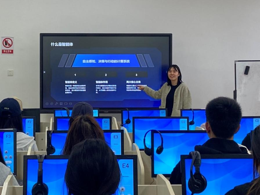 讲座围绕人工智能智能体的概念、分类与应用展开。周薇老师系统介绍了智能体的基本定义、单智能体与多智能体的区别、智能体制作实战方法,以及工作流的核心概念。通过翻译智能体实例,师生们直观感受到智能体在语言服务中的应用潜力。