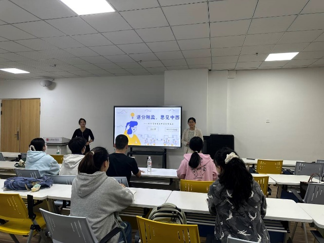 2026年4月9日,外国语学院英语专业院级公开示范课在国际交流中心114举行。本次示范课以“语分刚柔,思见中西——从主谓结构看双语思维范式”为题,由英语专业教师王小芳主讲,教研室主任刘慧玲主持。